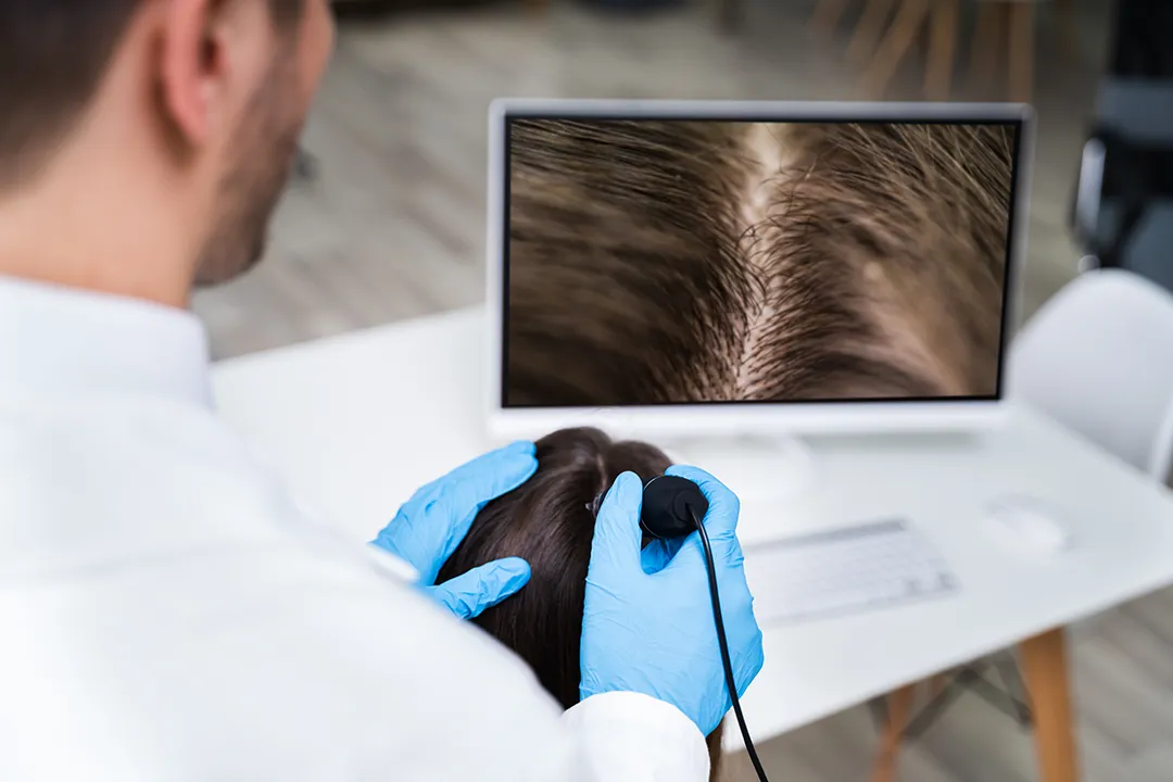 Our certified Trichologist specializes in evaluating hair and scalp conditions using a high-magnification Trichoscope during a comprehensive in-office visit.